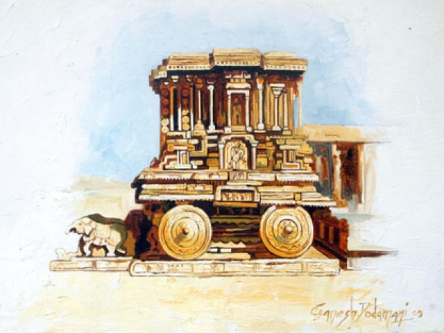 Title All of my paintings represent Hampi temples, a place to frequent regularly because its intricate carvings, it architecture and the play of light and shadow on the temples evoked a fascination in me. My representation of the temples, people and nature arou