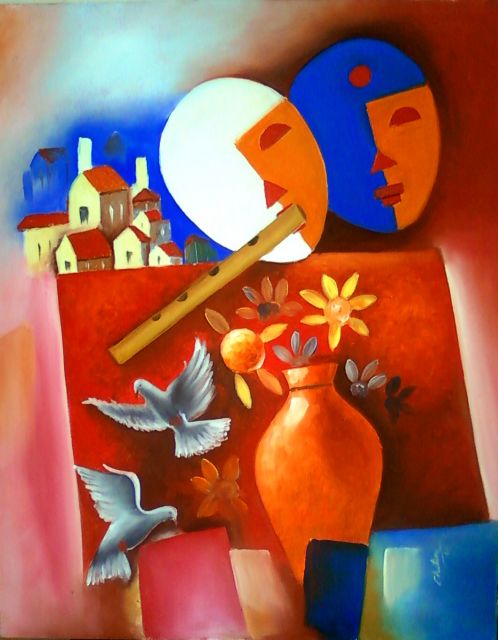 Title Chetan�s composition of an abstract village scene is a delightful combination of colours mixing modernity with tradition. Through his abstract impressionistic work, Chetan Katigar likes to present and re-present people and things,that cannot or will not