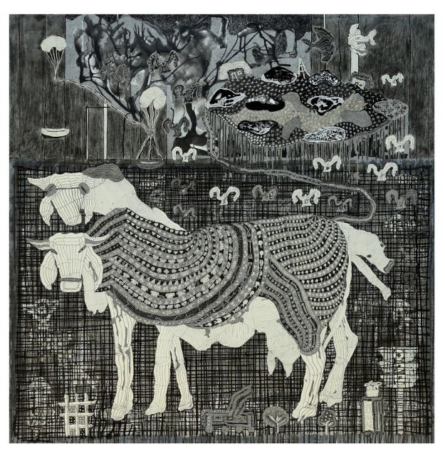 Medium pen & ink, pencil and acrylic on canvas