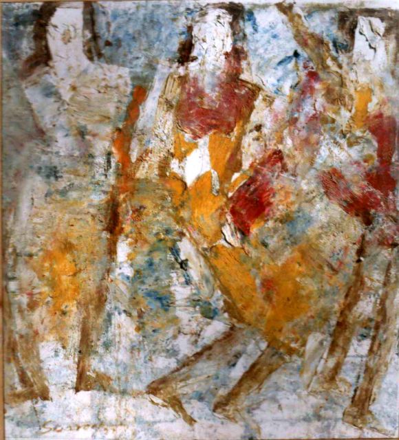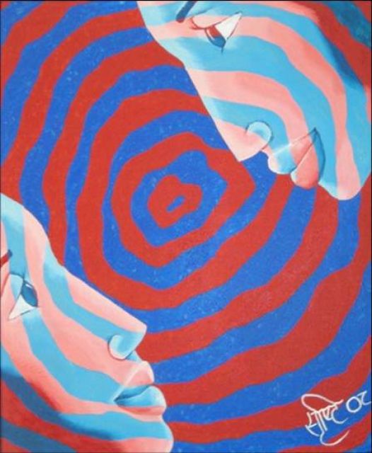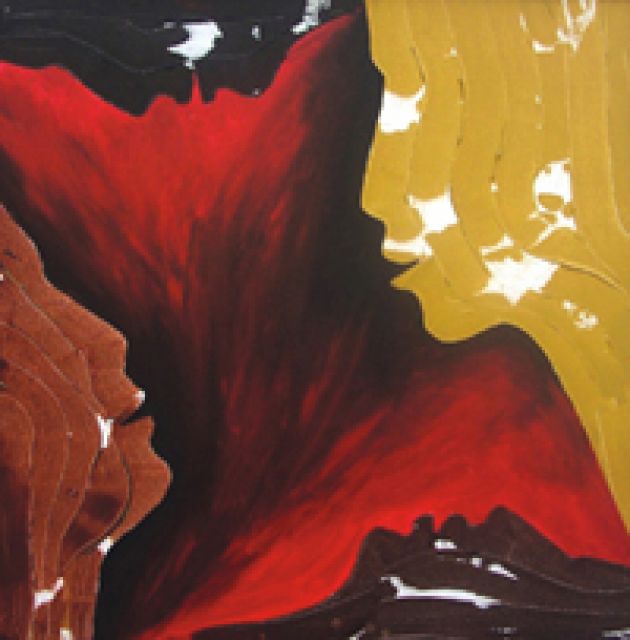 Title The ochre image on the right hand portion of the frame has deliberately been left with unpainted portions to depict the layers each of us has, which come to the fore, in inter-personal interactions. All the four images are layered and the painting can be